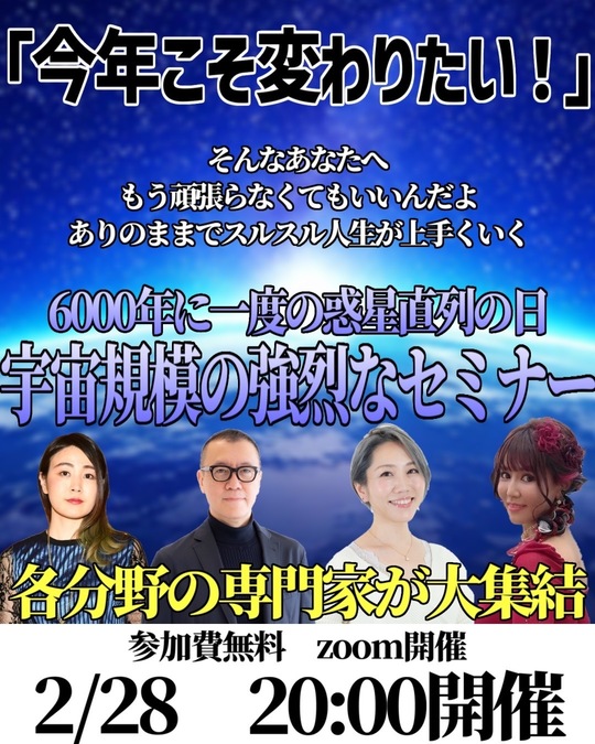 今年はいろいろなことに挑戦していこうとスタートしたのですが、先週の2月28日、7天体(水星、金星、火星、木星、土星、天王星、海王星)の惑星直列が起こり、さらに新月とも重なるという凄い日の夜に、お声がけをいただき、今年こそ変わりたい人のための「惑星直列セミナー」というオンラインセミナーを開催し、反響をいただきました。